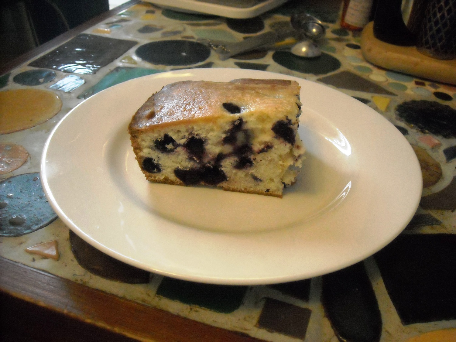 Cream butter and sugar. (I do this by hand – it only takes a couple of seconds.) Add egg and incorporate well. Add milk in about 4 increments. In a separate bowl, mix flour and baking powder. Add to wet ingredients and mix until all dry ingredients are incorporated. Fold in blueberries. Pour into 8×8 pan (spray with non-stick spray, or butter and flour your pan) and bake for 35 minutes at 375 degrees F. If you are using frozen blueberries, an additional 10 minutes should be added to the cook time. (That is, if the blueberries are still frozen when you throw them in the batter!) Test the center of the cake to see if it is done.