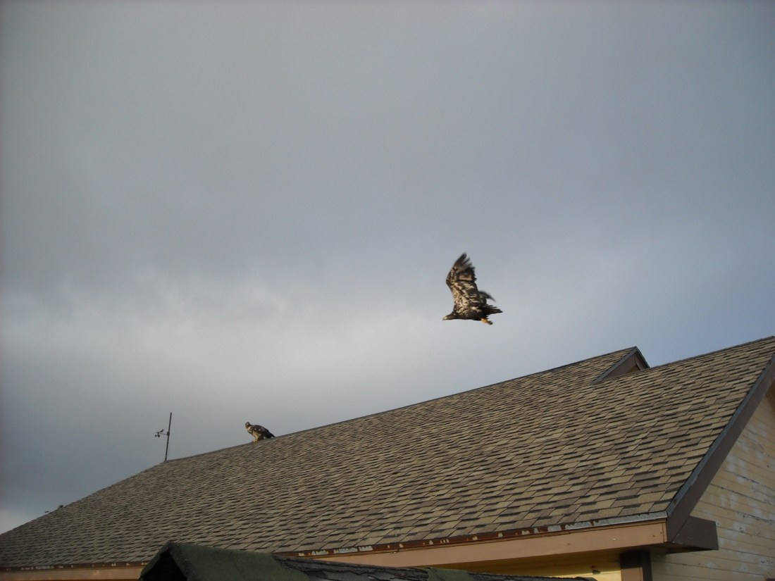 Someone was feeding eagles yesterday. I don’t know if it was my idiotic neighbor who thinks it is his god given right to feed wildlife, or if it was accidental feeding from an offload of a fishing boat. Or if someone cleaned out their freezer. But someone was feeding the eagles yesterday. This led to at least 3 hours of thumps on the roof, fights and squabbles over both food and advantageous perching, and eagles whizzing down the street at about head height. And I’m not talking three or four eagles. I am talking about seventy-five. Very irritating…and dangerous.