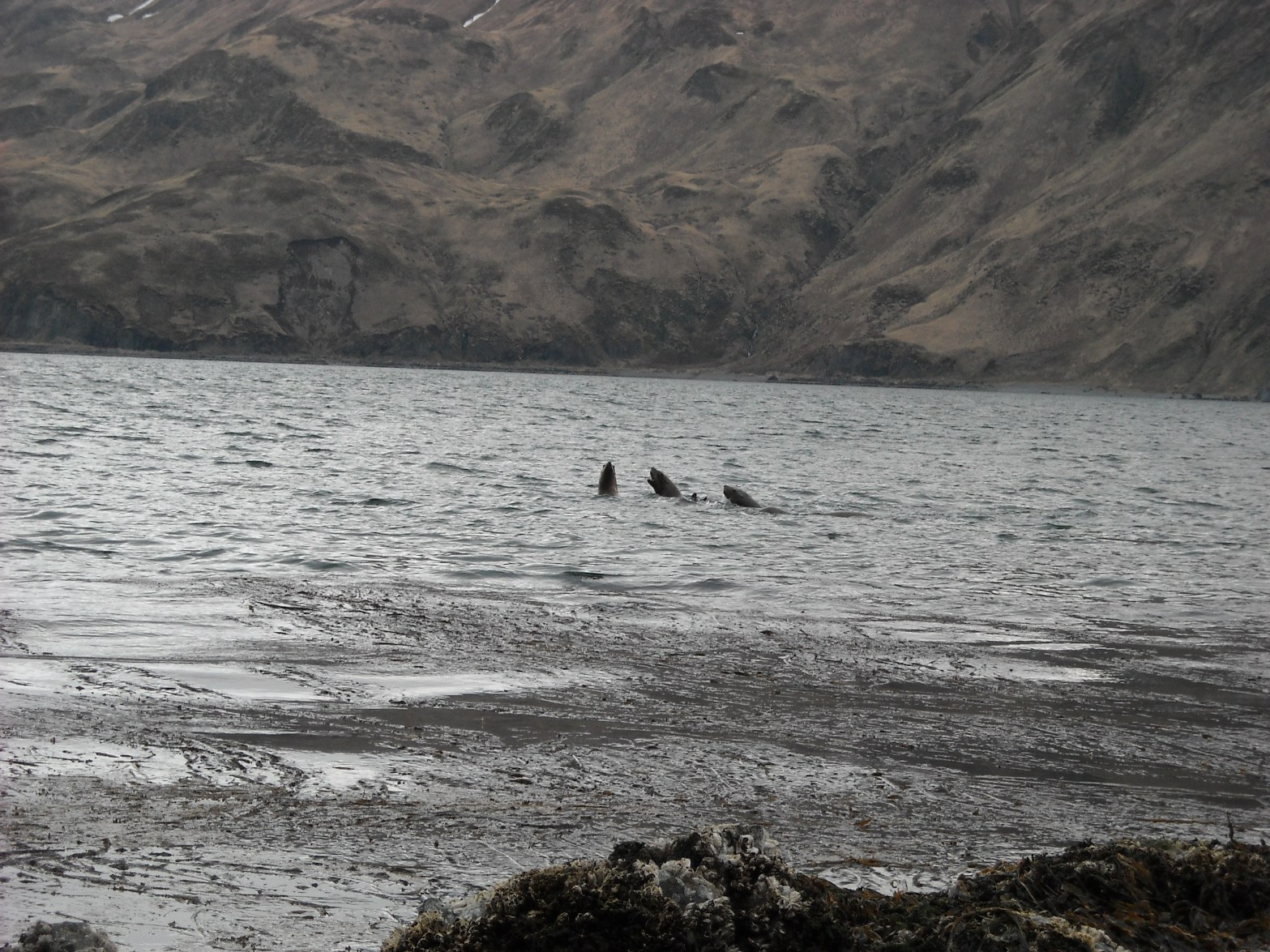 By the time I got out there after going all the way over to airport to drop off lunch, they had decreased in numbers to about 9. But they were so roly poly fat. And all different colors. Just basking away the afternoon in the winter sun; sharing space with Emperor geese who were grazing in the near shore waters.