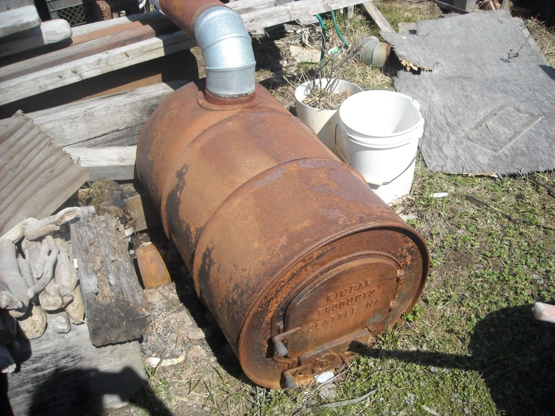 Then, after Caleb got up from trying to take a nap (hahaha) before having to go back to work, we heard some bumping and thumping around outside. Caleb says, “Now what is your dad up to?” Me – “I don’t know.” Caleb – “Is he fixing up a new oil drum for the smokehouse?” Me – “Looks like it.” And…..he’s off and running. I swear. No rest for the wicked! The old one was having some major issues with the door last year.